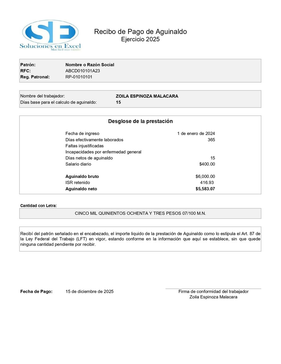 El sistema esta totalmente automatizado, te sirve para realizar los aguinaldos de los ejercicios 2023, 2024 y 2025, solo necesitas capturar los datos generales del patrón, confirmar el valor de la UMA, el año del ejercicio y el número de días que se otorgan a los trabajadores (predeterminado 15 días), en el caso de la hoja de trabajo capturas: