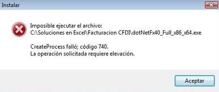 AVISO DE SISTEMA "CreateProcess falló; código 740, La operación solicitada requiere elevación"